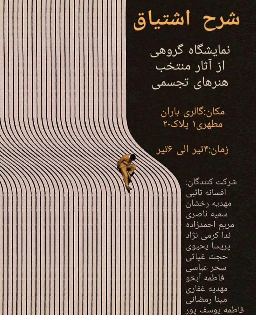 “شرح اشتیاق” نمایشگاهیست گروهی از آثار منتخب هنرهای تجسمی. شرکت کنندگان این مجموعه عبارتند از: افسانه تائبی، مهدیه رخشان، سمیه ناصری، مریم احمدزاده، ندا کرمی نژاد، پریسا یحیوی، حجت غیاثی، سحر عباسی، فاطمه آبخو، مهدیه غفاری، مینا رمضانی و فاطمه یوسف پور